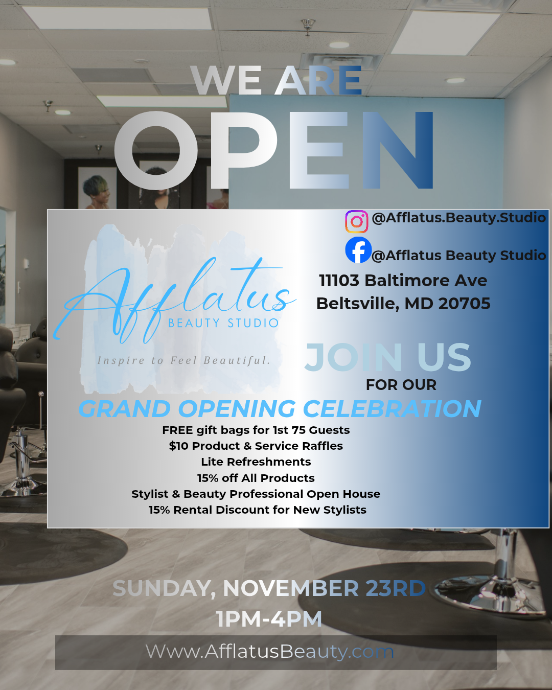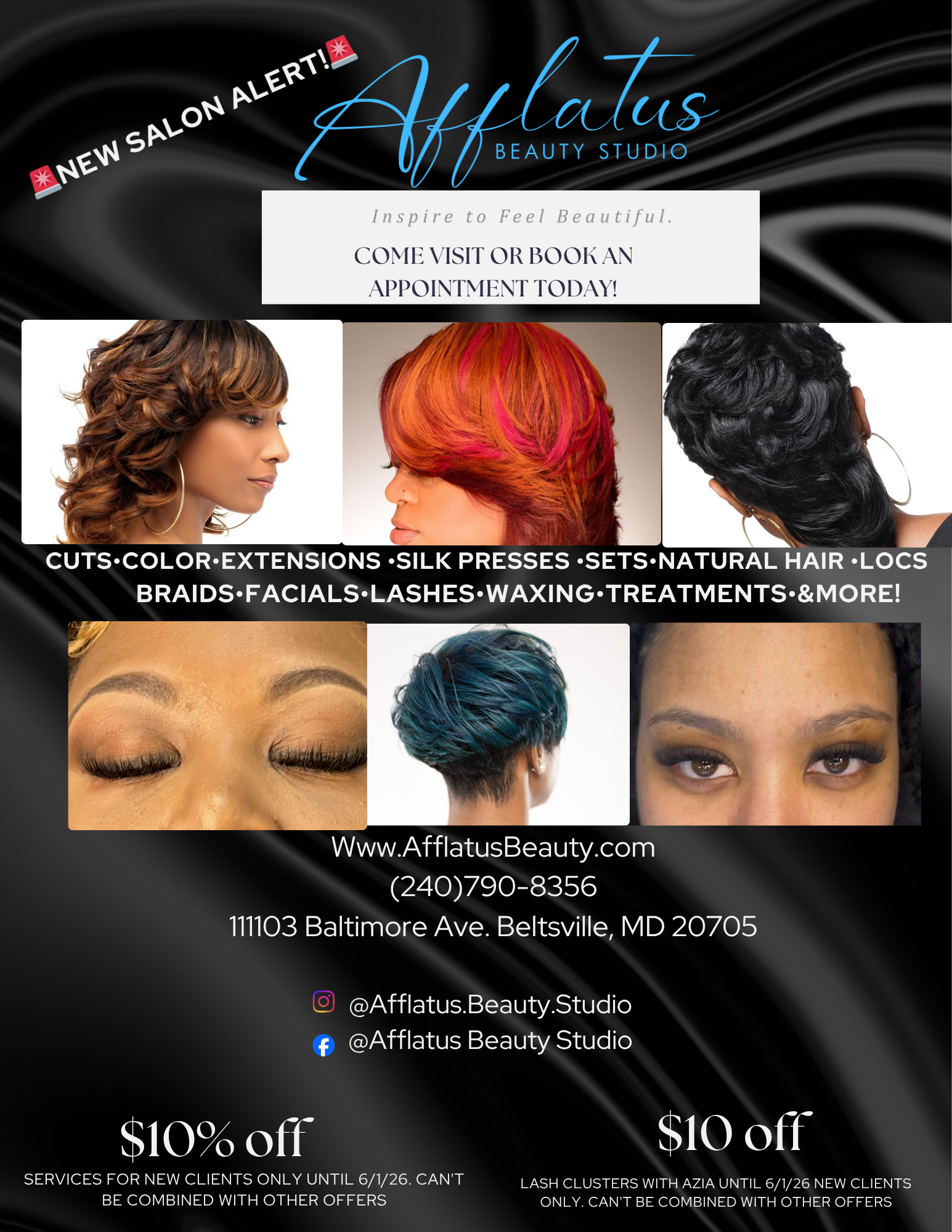 We believe in beauty with purpose. From local pop-ups and styling workshops to charity drives and community events, Afflatus Beauty Studio is dedicated to giving back and creating meaningful experiences for our clients and neighbors.